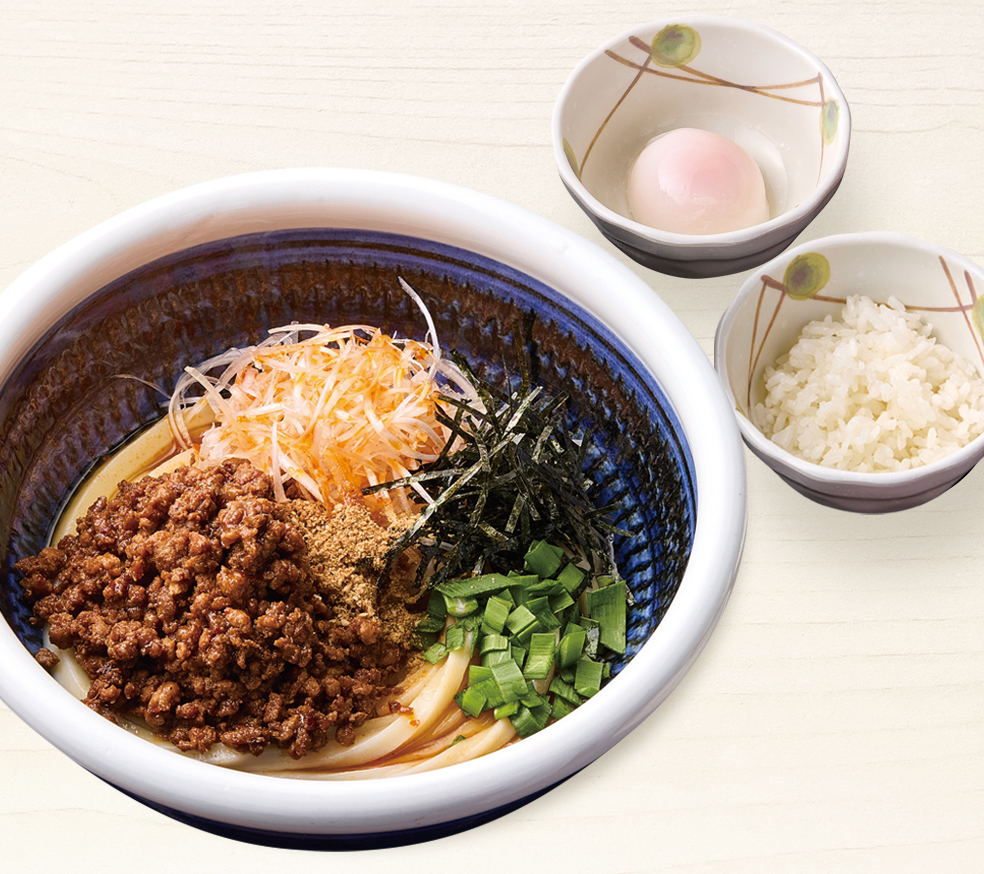 広島県限定!ピり辛そぼろと香味野菜のガッツリうどん ミニごはんと温泉玉子付き