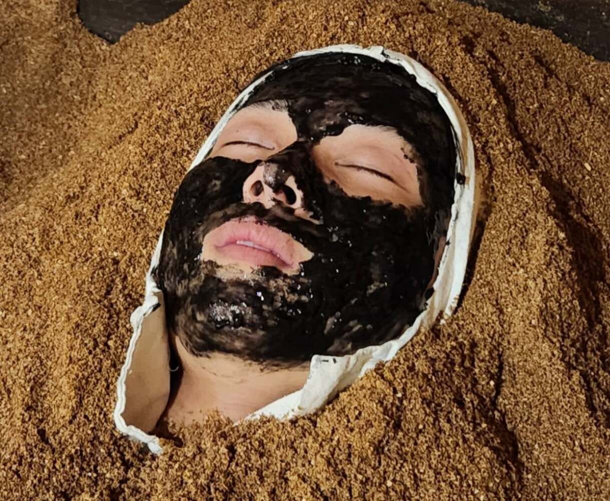 温浴中、タオルの上からお顔に暖かいひのきパウダーをかけ眼精疲労や眼の疲れからくる肩こりを解消します。温熱効果で目が本当にスッキリします。顔から沢山汗が出て、酵素の力で毛穴のヨゴレも取れるのでお肌もピカピカになります。