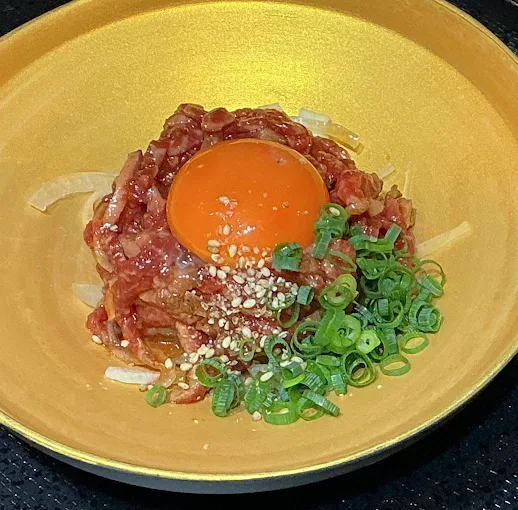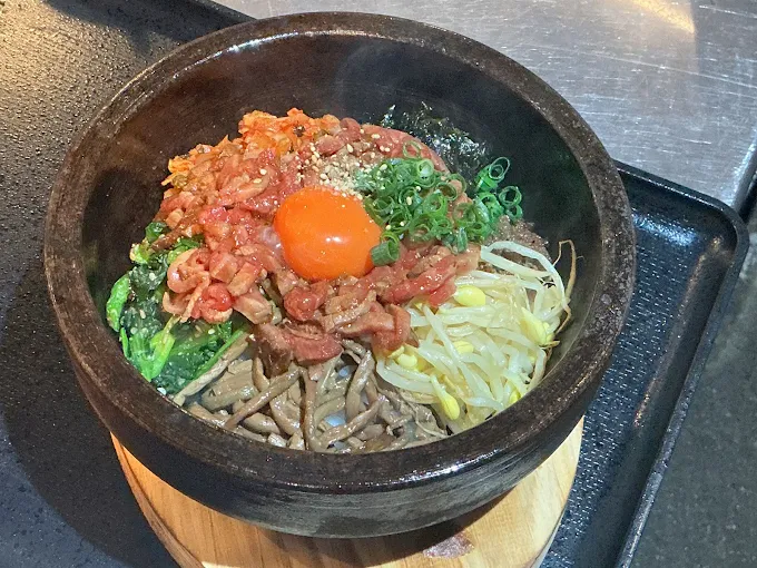 山形牛の炙りユッケを乗せた石焼きビビンパ! ユッケのタレとお肉の旨みが混ぜ込まれた石焼きビビンパは最高です!