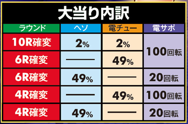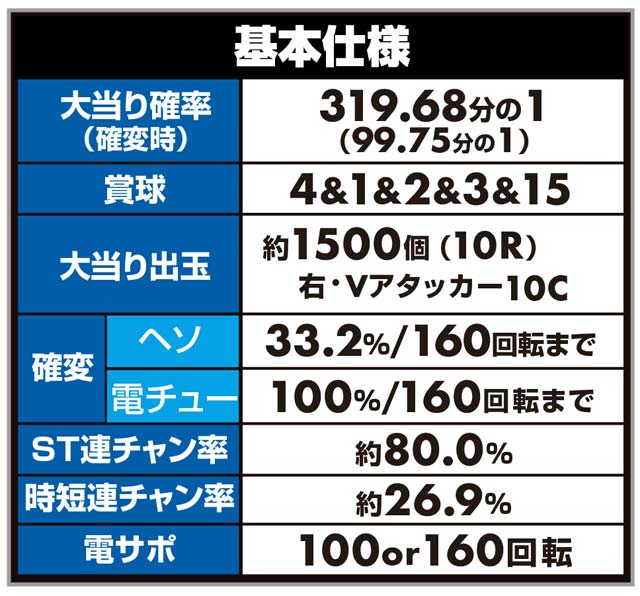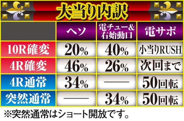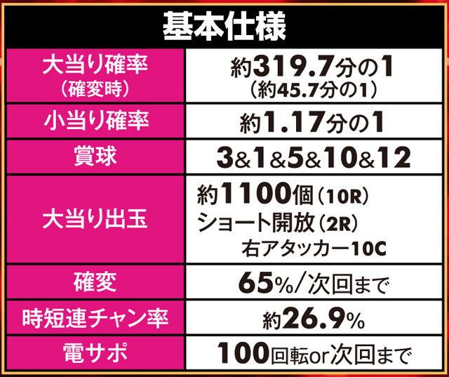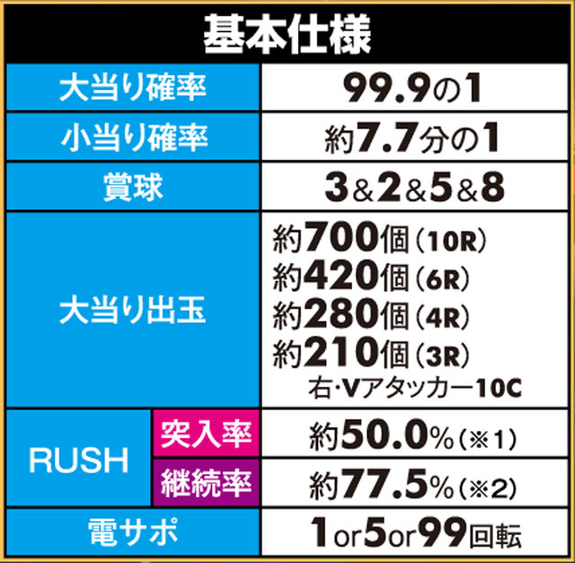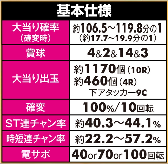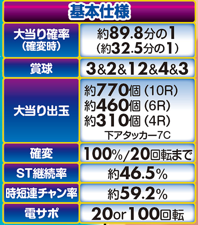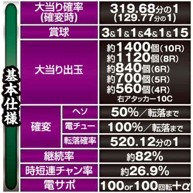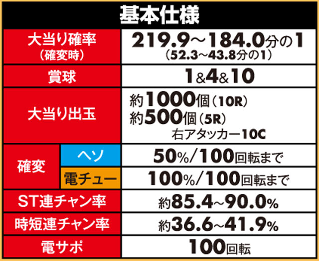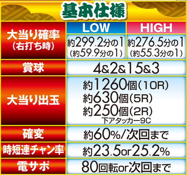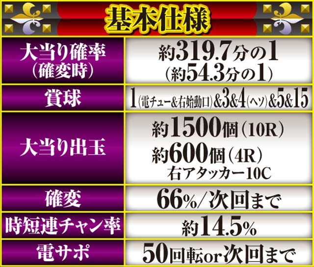 「ルパン三世」シリーズ最高の継続率を持つ、6段階設定付きのV-ST機。初当りで突入するのは主に時短100回転で、ここで引き戻すことができればMAX約92.5%を誇るST「GOLDEN TIME」に突入! ルパン史上最高にスリリングな右打ちが体験できる。