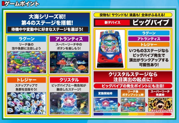 シンプルなゲーム性はそのままに、新ステージや新ギミックが追加されて『大海物語』が再びホールに凱旋。大当りのカギを握る「ビッグバイブ」は、役物、液晶、サウンドのすべてが震える新感覚の重要演出となっている。また、既存の3ステージに加えて新たに「クリスタルステージ」が追加されているのも見逃せないポイントだ。