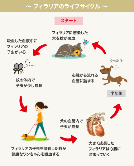 フィラリア(犬糸状虫)症は、『感染している犬の血を吸った蚊』に刺されることで感染してしまう寄生虫による病気です。 正しく予防することで、ほぼ100%の予防効果があります。予防薬には錠剤、チュアブル、注射があります。 お住いの地域によって予防期間が異なります。気温表による評価から7~8ヶ月間の予防を推奨しています。近年通年予防をする方も増えています。