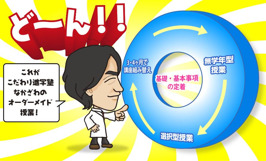 オーダーメイド授業とは「自分だけの勉強法」を組み立てることができる授業の選択方法です。 20の講座より効率的に組み立てることができ、その目的は基礎・基本事項を【定着】させることです。 受験カリキュラムを進めていくと、必ずどこかで“つまづく”ものですが、つまづくことなくスムーズに受験カリキュラムを進める為には、基礎・基本事項を定着させることであり、そのためにオーダーメイド授業を導入しているのです。