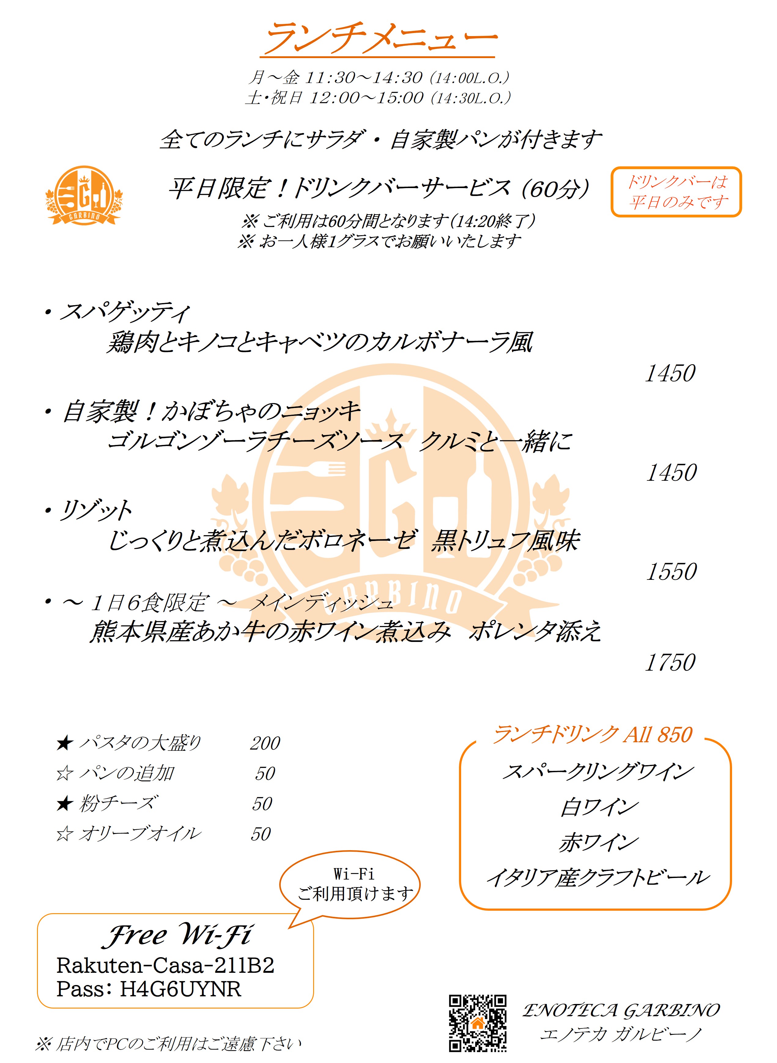 ※ドリンクバーサービスは平日のみです。 ※ 仕入れ状況により途中でメニューが変更となる場合がございます