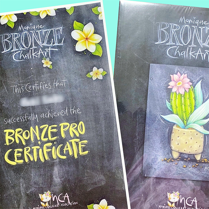 全45時間 ¥162,000(分割払いは6回まで可能)。 MCA基礎コース修了生が対象。 チョークアートに必要な以下の全ての技術を学ぶ事ができます。(メニューの白文字とタイトルの文字の書き方、見やすいレイアウト方法、コーヒーを美味しそうにかくコツやカップ、ソーサーの描き方、ケーキの描き方、バーガーサンドイッチやコールドドリンクの描き方、タイトルを応用した書き方) コース終了時にはモニーク・キャノンより修了書を発行いたします。