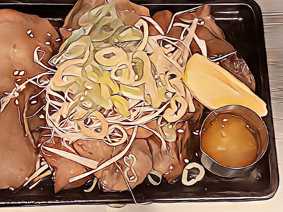 自家製の塩煮込みの牛すじを 定番のネギ焼きにトッピング 溶き卵でオムレツ風に仕上げました