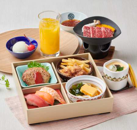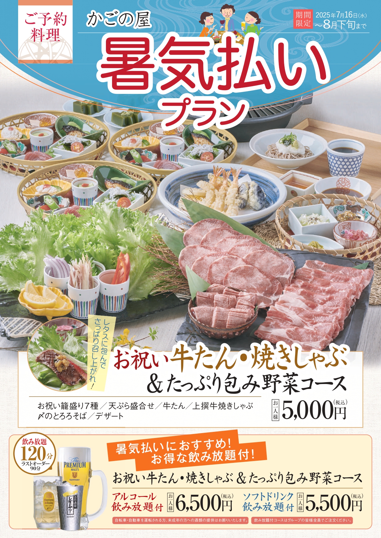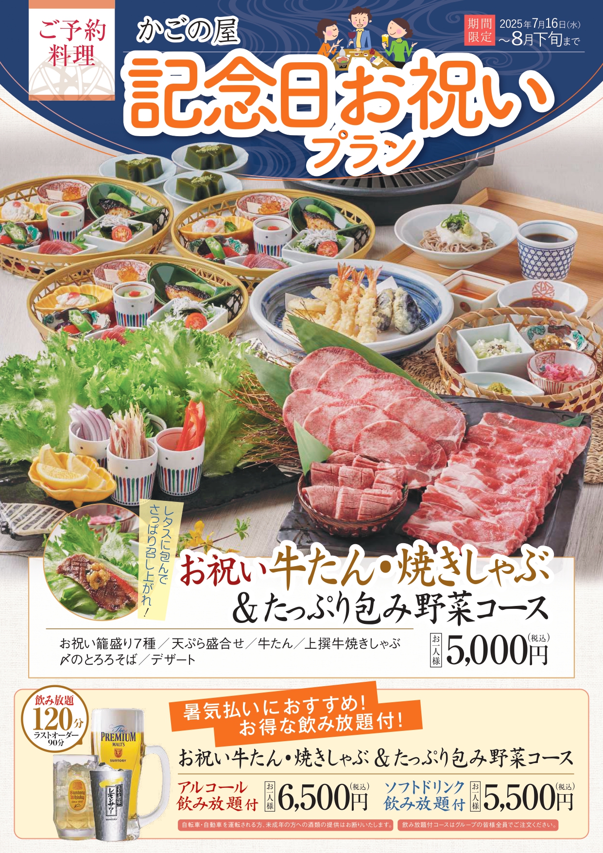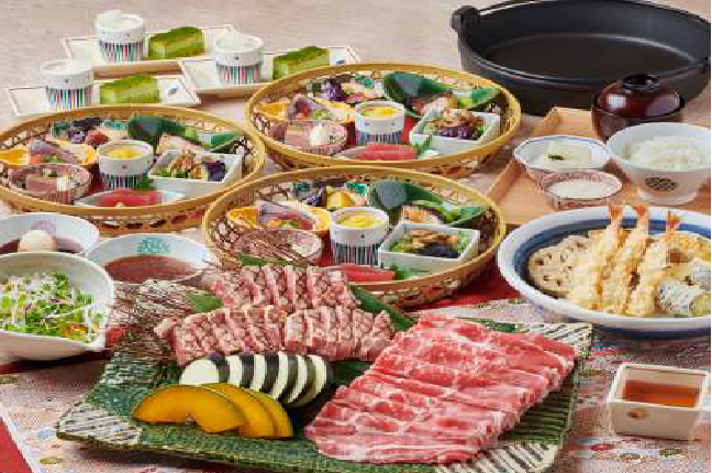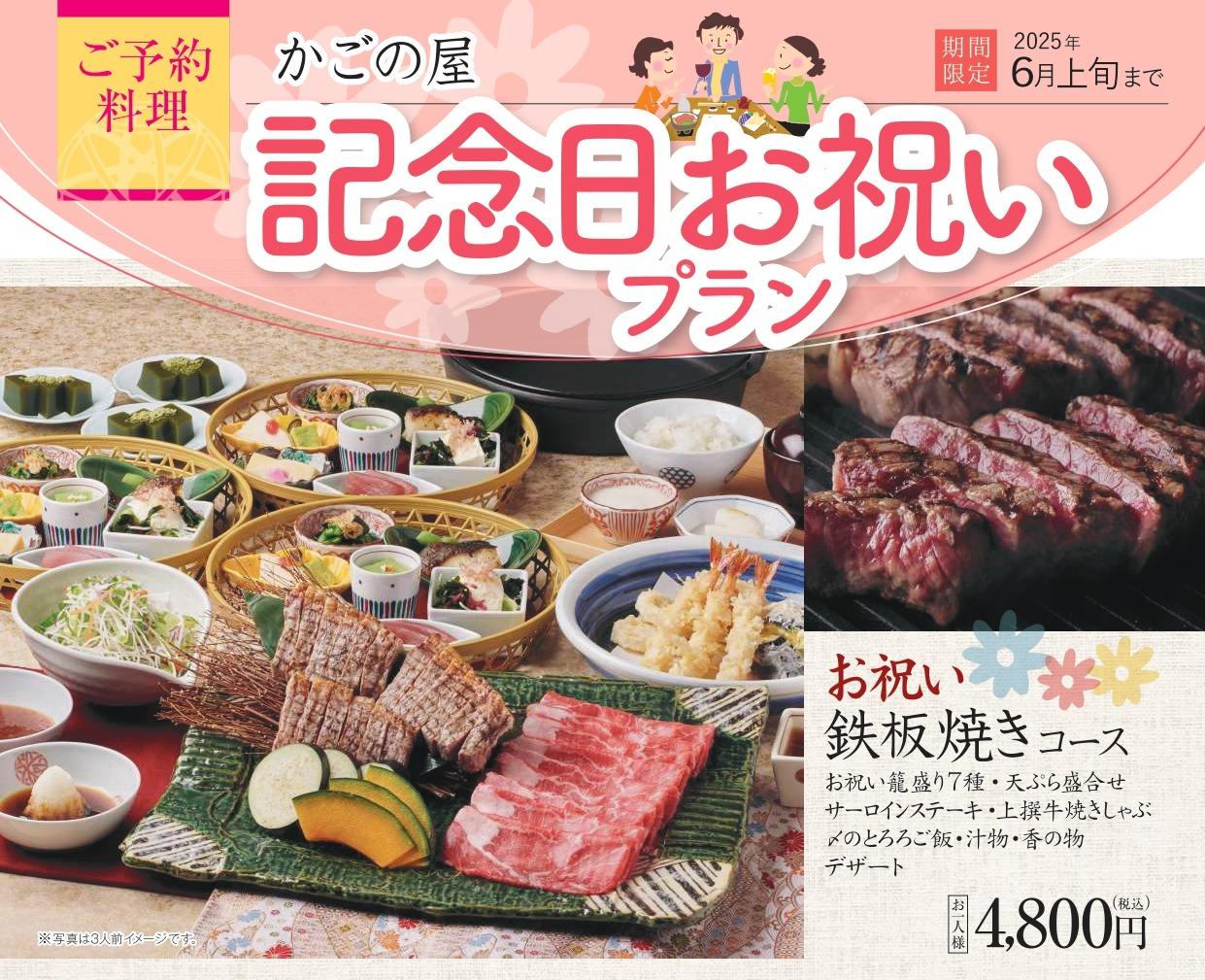 お祝い籠盛り7種・天ぷら盛合せ・サーロインステーキ・上撰牛焼きしゃぶ・〆のとろろご飯・汁物・香の物・デザート(Festive basket platter (7 types), assorted tempura, sirloin steak, grilled grilled beef shabu, tororo rice, soup, pickled vegetables, dessert)