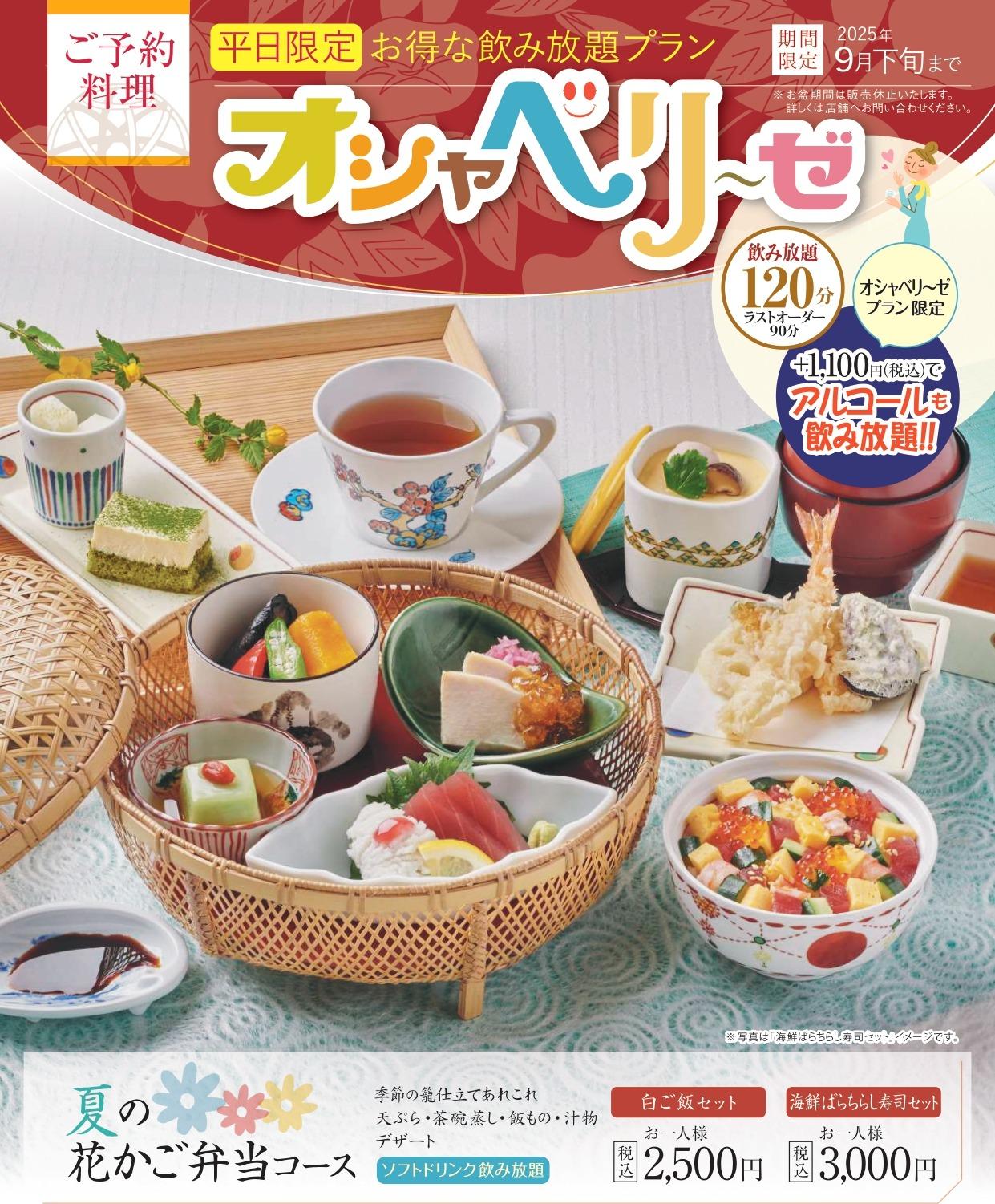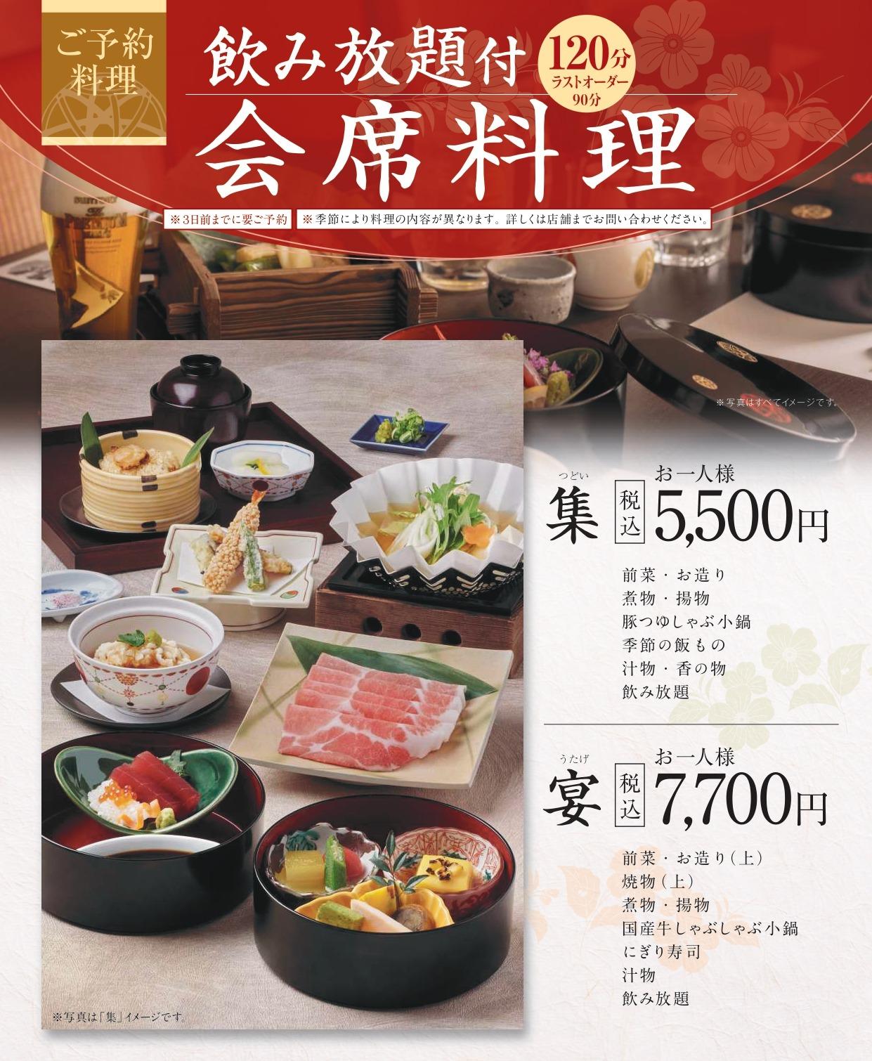 前菜・お造り・煮物・揚げ物・豚つゆしゃぶしゃぶ小鍋・季節の飯もの・汁物・香の物・飲み放題(Appetizers, sashimi, boiled dishes, fried dishes, pork soup shabu-shabu small pot, seasonal rice dishes, soups, pickled vegetables, all-you-can-drink)
