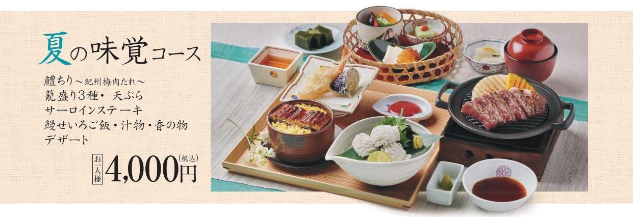 鱧ちり~紀州梅肉たれ~・籠盛り3種・天ぷら・サーロインステーキ・鰻せいろご飯・汁物・香の物・デザート(Hamo chiri with Kishu plum sauce, 3 types of basket dishes, tempura, sirloin steak, eel steamed rice, soup, pickles, and dessert)