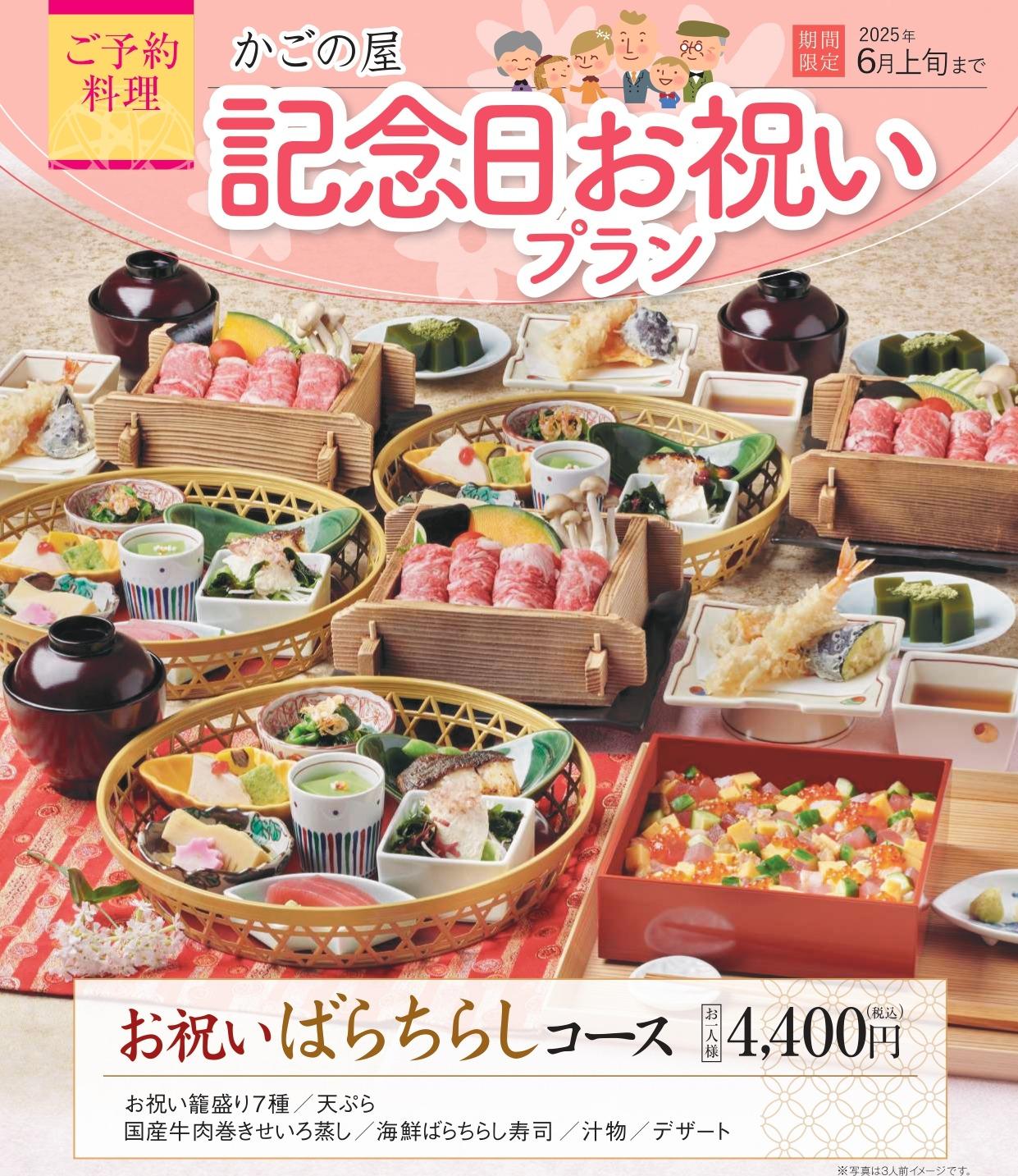 海鮮ばらちらし寿司・国産牛肉巻きせいろ蒸し・天ぷら盛合せ・お祝い籠盛り・デザート (Seafood chirashi sushi, steamed domestic beef rolls, assorted tempura, celebratory basket platter, dessert)