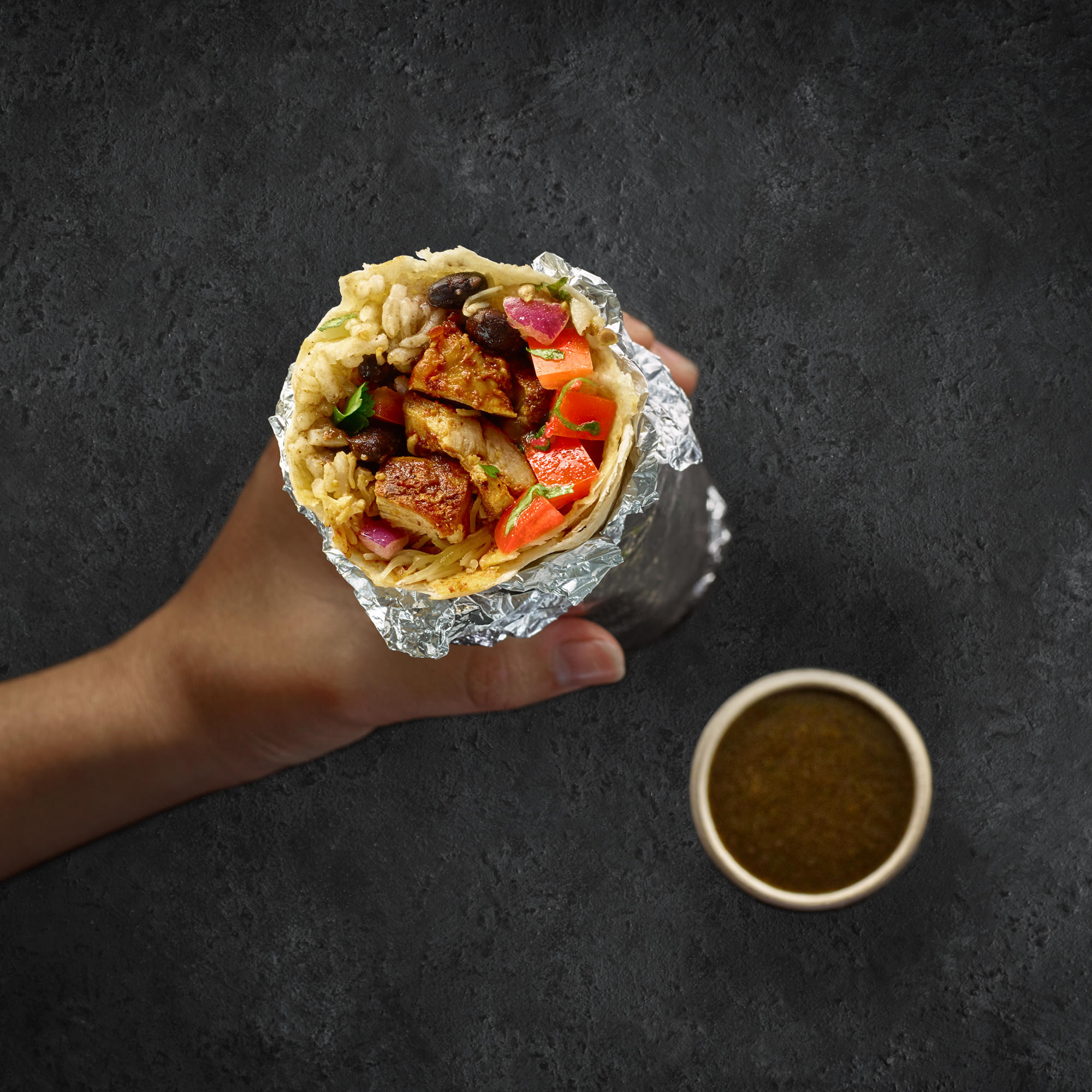 ライス,ジャックチーズ,ブラックビーンズ,サルサ&フィリングを小麦トルティーヤで巻いたい料理となります。 ◆お選び頂けるフィリング: - グリルチキン - 煮込んだポーク - 煮込んだビーフ ※レギュラー+50円 ラージ+100円 - 白身魚 - ソテーした野菜とワカモレ(アボカドペースト) ※レギュラー+50円 ラージ+100円