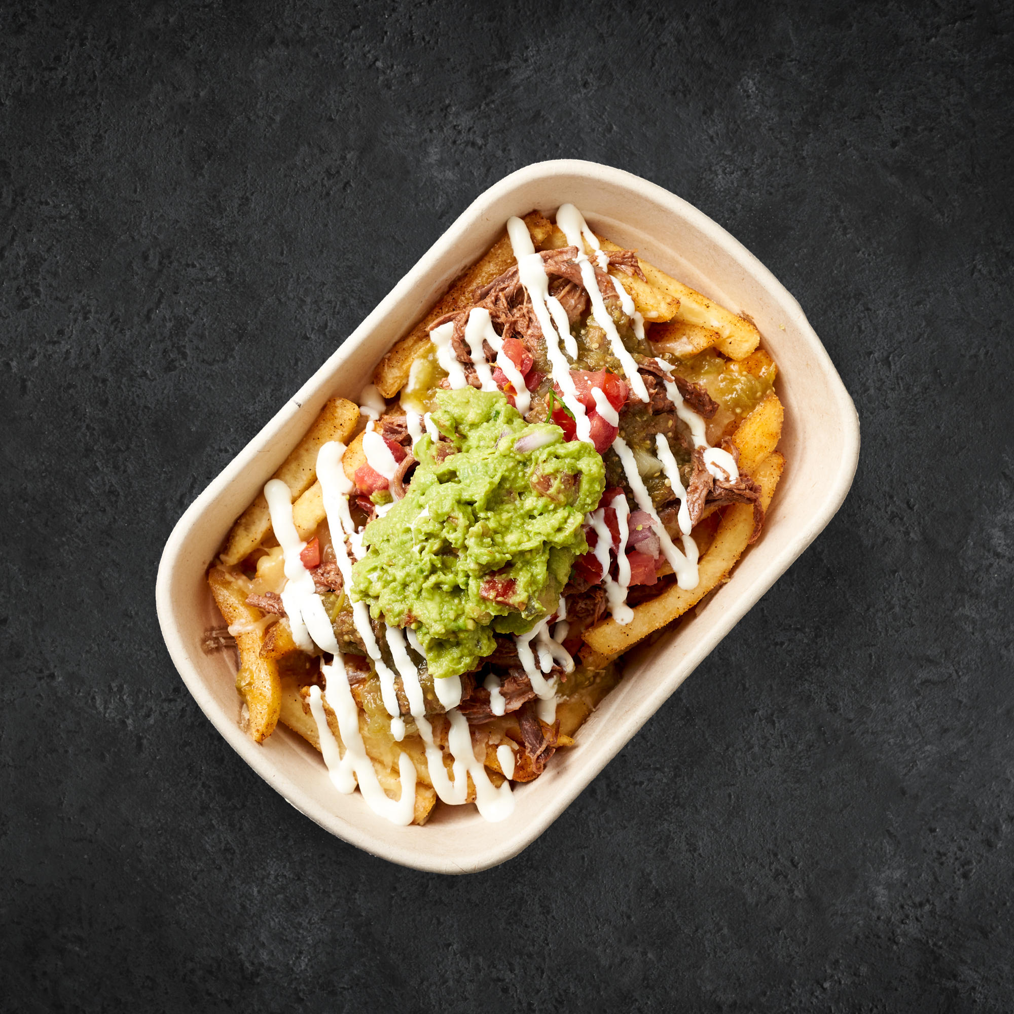 ポテトフライ,ジャックチーズ, サルサ, サワークリーム, ワカモレとフィーリングのお料理となります。 ◆お選び頂けるフィリング: - グリルチキン - 煮込んだポーク - 煮込んだビーフ ※レギュラー+50円 ラージ+100円 - 白身魚 - ソテーした野菜とワカモレ(アボカドペースト) ※レギュラー+50円 ラージ+100円