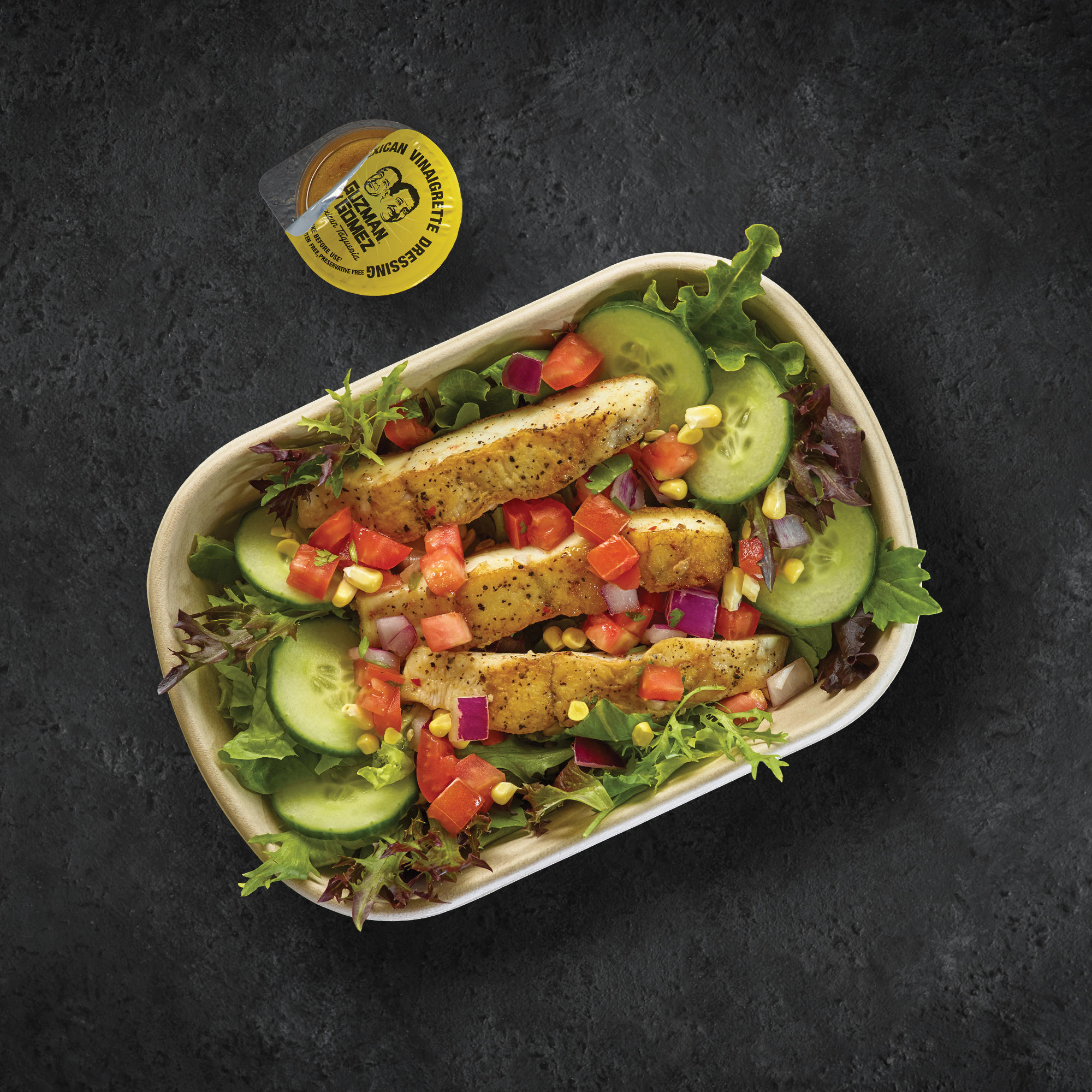 ミックスサラダ,コーン,キュウリ ,ピコデガヨ , ビネガードレッシングとフィリングが盛り合わせのサラダです。 ◆お選び頂けるフィリング: - グリルチキン - 煮込んだポーク - 煮込んだビーフ ※レギュラー+50円 ラージ+100円 - 白身魚 - ソテーした野菜とワカモレ(アボカドペースト) ※レギュラー+50円 ラージ+100円