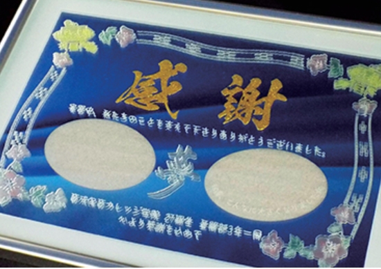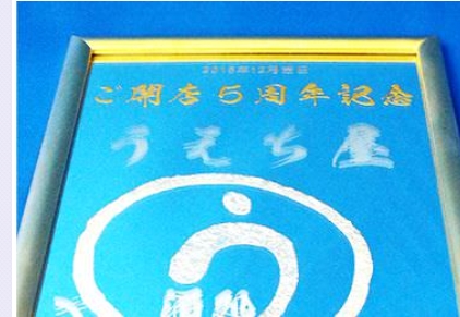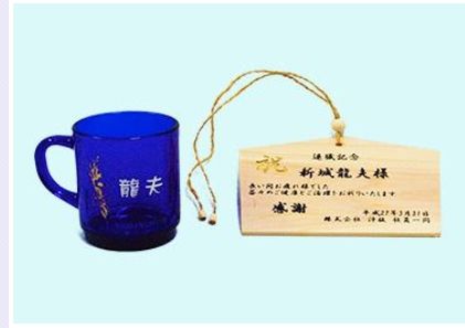 絵馬や木箱などの木製品や、名刺入れやカップなどのステンレス製品に彫る事も可能です。 その他、クリスタルのトロフィーや楯、ガラススタンドを使用した結婚式のウェルカムボードなども作成可能です。 名入れしたいアイテムがあれば、お気軽にご相談ください。