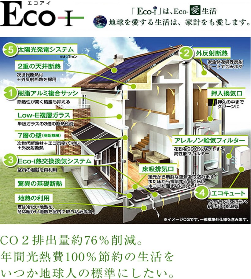 太陽光を上手に活用するシステムやCO2削減の設備や高断熱性を追求し、結果としてきれいな空気で健康に暮らせ、光熱費を節約できる優れた住宅です。 光熱費やランニングコストの削減にご興味がある方も安心。太陽光を上手く活用し、高断熱性を追求する「Eco‒i」システムなら地球だけでなく家計にも優しいマイホームが実現できます。