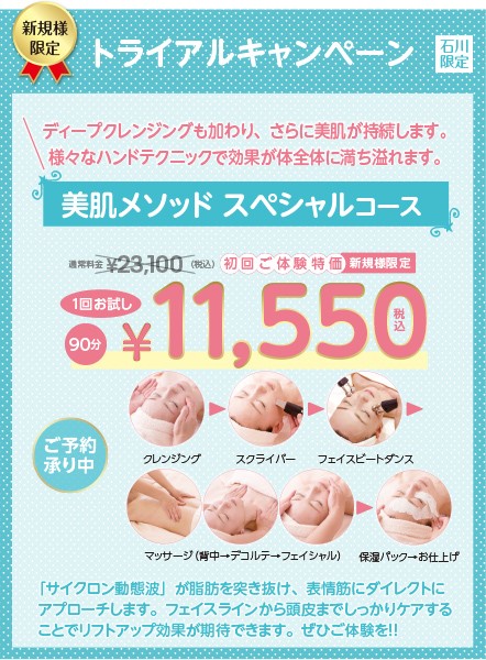 90分(初回ご体験価格) ディープクレンジングも加わり、さらに美肌が持続します。 様々なハンドテクニックで効果が体全体に満ち溢れます。 「サイクロン動熊波」が脂肪を突き抜け、表情筋にダイレクトに アプローチします。フェイスラインから頭皮までしっかりケアする ことでリフトアップ効果が期待できます。ぜひご体験を! 通常価格23100円