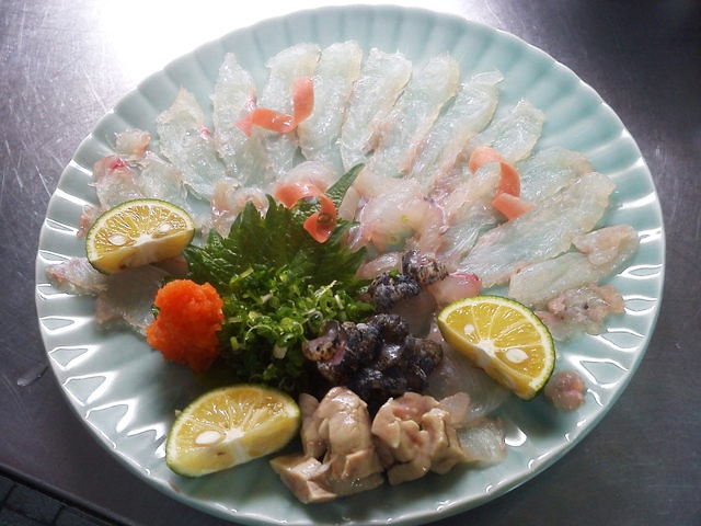 瀬戸内海の「オコゼ」の他に、 春は「目板ガレイ」夏は「アコウ」冬は「カワハギ」など、 その季節にあった薄造りを自家製ポン酢でお召し上がり下さい。 天然鯛の薄造りは1年間楽しめます。