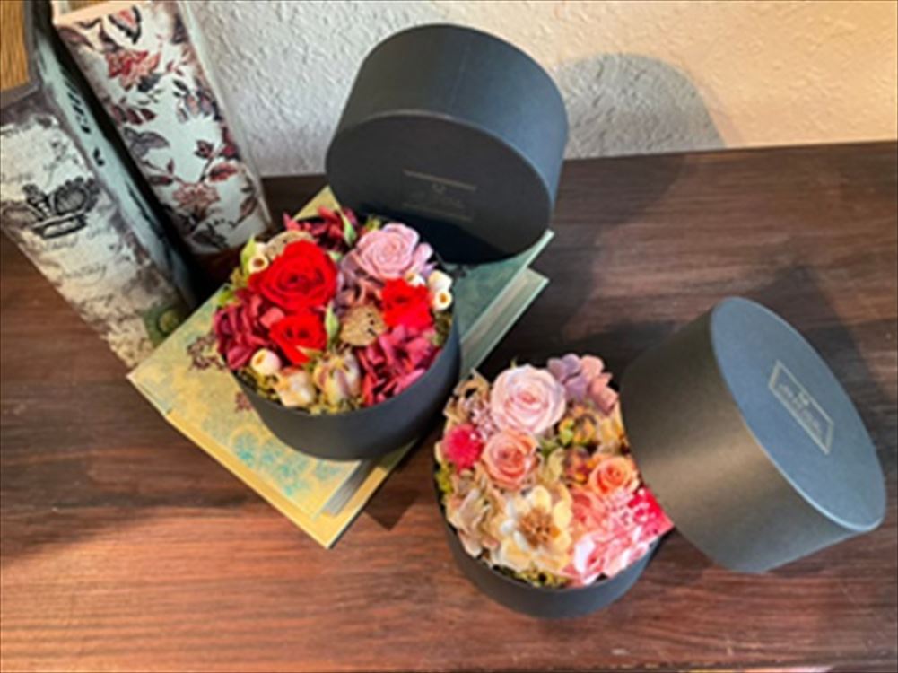 生花に特殊な加工を施した、長期間たのしんでいただけるお花です。3000円~(税別)