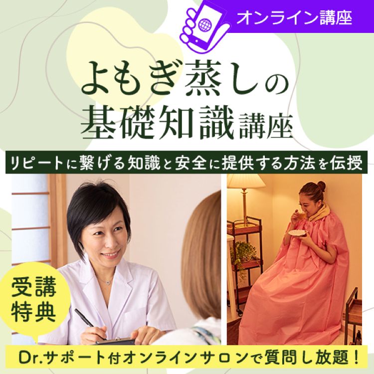 お悩み別のよもぎ蒸しのやり方や、 安全に提供する方法、売り上げアップの具体例まで、よもぎ蒸しの基礎の知識とともにしっかり学べる講座です。