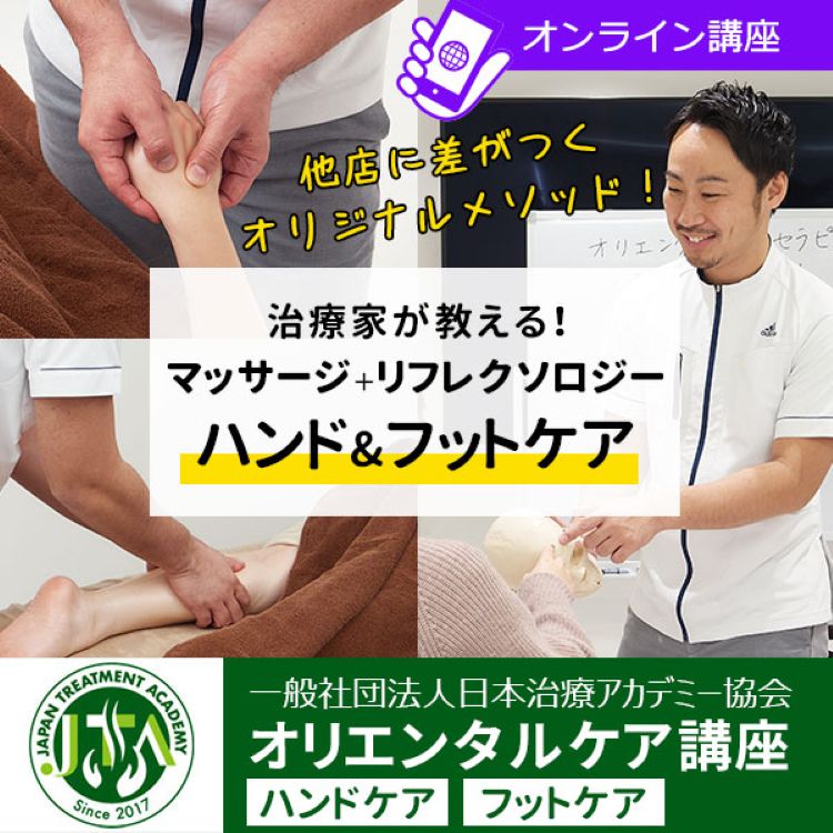 このオンライン講座では、一般社団法人日本治療アカデミー協会 代表理事である治療家歴21年の講師が、「解剖学」「東洋医学」の理論を元に確立したオリジナルの「ハンドケア」「フットケア」メソッドをお伝えします。