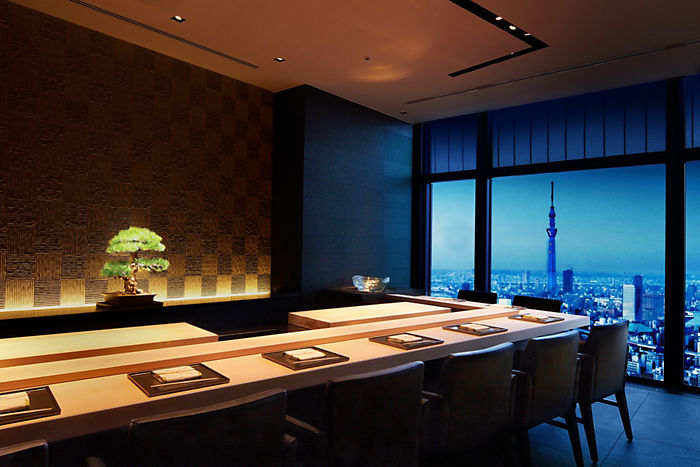 Located on our 38th floor, Sushi SORA offers both the freshest, most delicious sushi and a wonderfully serene setting. With floor-to-ceiling windows, diners enjoy breathtaking views of the Tokyo Skytree® tower and dynamic city panorama Featuring granite floors and Japanese Kawara tile walls, the restaurant’s eight-seat dining counter fashioned from 350 year-old Japanese cypress forms the stage for Chef Yuji Imaizumi’s breathtaking talent. With more than some decades experience, Chef Imaizumi is a true master of Tokyo’s authentic “Edo-mae” style of traditional sushi cuisine, enchanting diners with his gracious and elegant style of preparation. Following the mantra of ‘simple is best’, Chef Imaizumi’s creations are renowned throughout Tokyo.