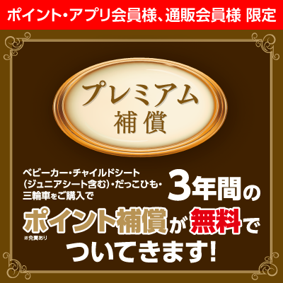 アカチャンホンポのポイントカード会員様、アカチャンホンポネット通販会員様が、アカチャンホンポで「ベビーカー」「チャイルドシート(ジュニアシート含む)」「だっこひも」「三輪車」を購入すると、購入日から3年間ポイント補償が“無料”でついてきます。 ※損害発生後45日以内にご請求ください。 誤使用や取扱不注意による破損など、メーカー保証対象外となる損害もカバー。誤使用や取扱不注意による破損など、メーカー保証対象外となる損害もカバー。 メーカーの修理見積代金相当額をアカチャンホンポポイントカード・nanacoネットポイントのポイントで補償。詳しくは店頭またはホームページにてご確認ください。