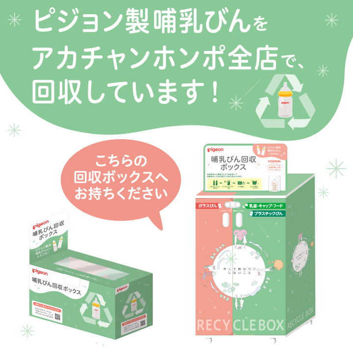 役目は終わったけど、思い出がたくさんつまった哺乳瓶はなかなか手放せないもの。 回収された哺乳びんは再資源化し別の製品へと生まれ変わります。 回収対象製品:ピジョンのプラスチック製哺乳びん・耐熱ガラス製哺乳びん、乳首、フード、キャップ ※ピジョン製品以外は対象外です