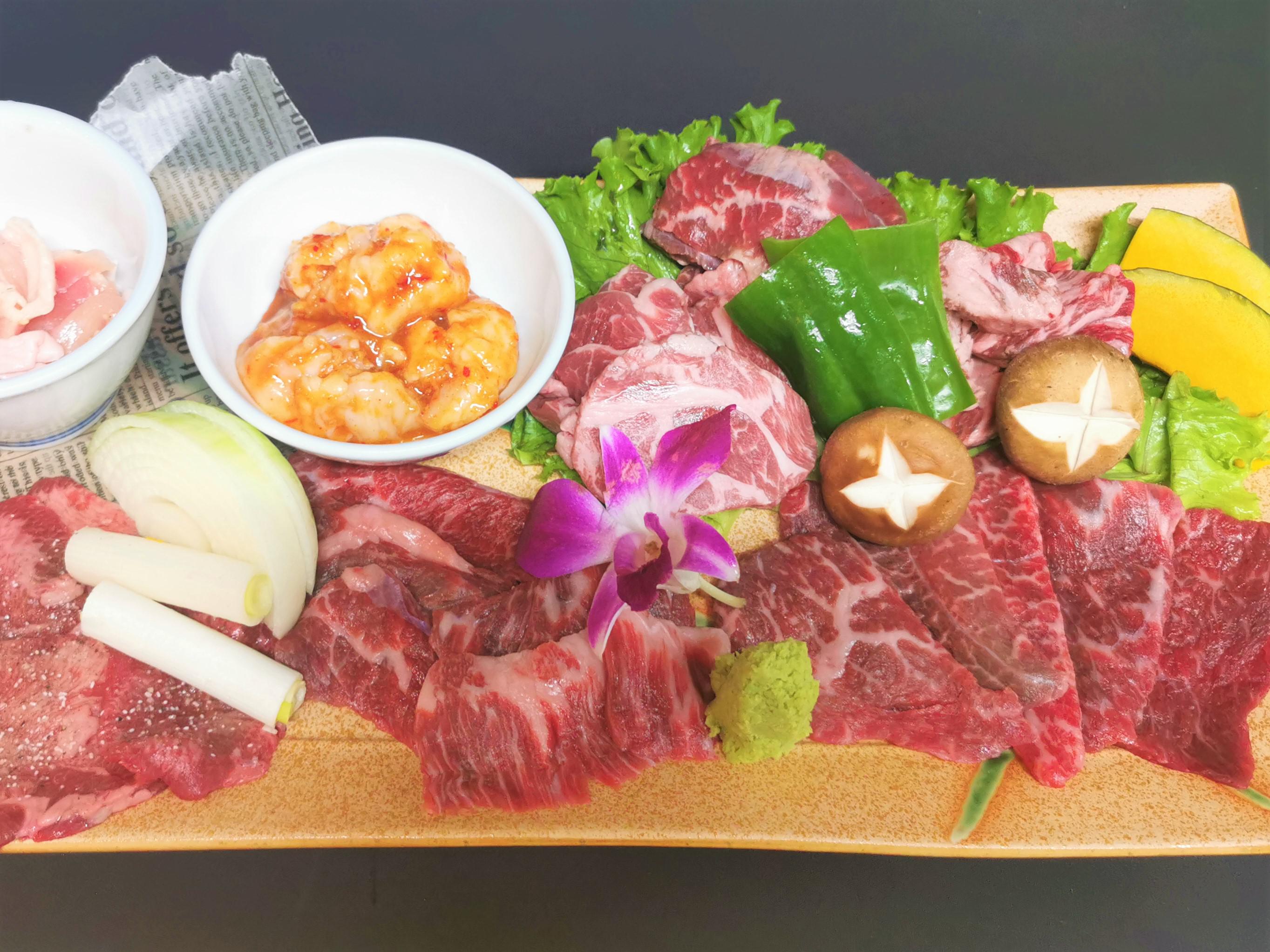いけだカルビ、いけだロース、いけだ中落、いけだホルモン、牛タン、USAサガリ、生ラム、中札内鶏もも、焼野菜