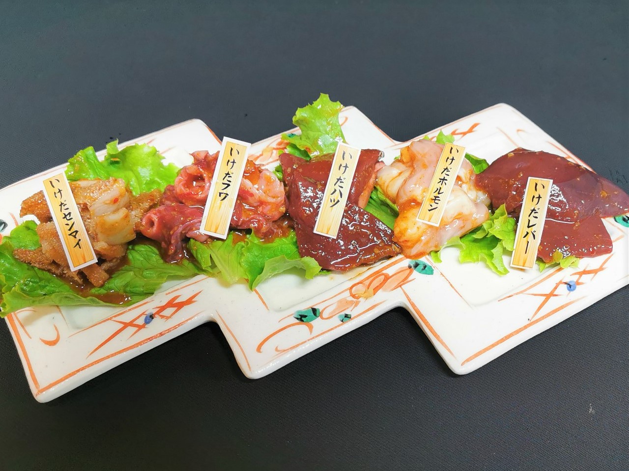 鶏セセリ、豚ホルモン、いけだ牛カルビ、USAサガリ、USA中落、豚タン、豚カルビ、焼野菜